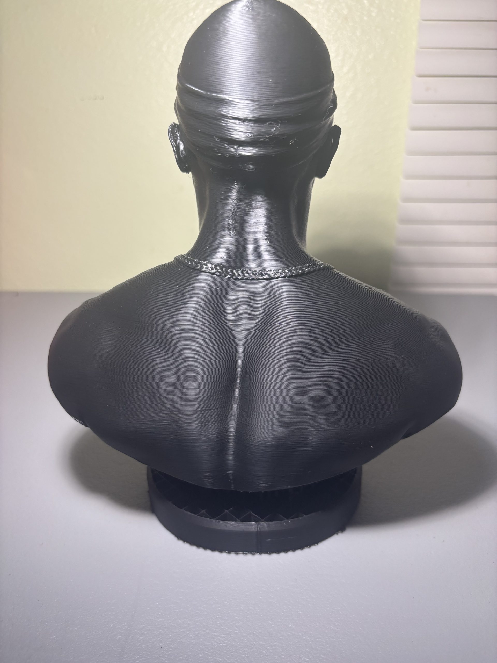 Honor the legacy of a hip-hop legend with this Tupac-inspired 3D-printed bust. Crafted with precision, this sleek black sculpture captures the essence of Tupac’s signature look, featuring his iconic bandana and a detailed cross pendant.